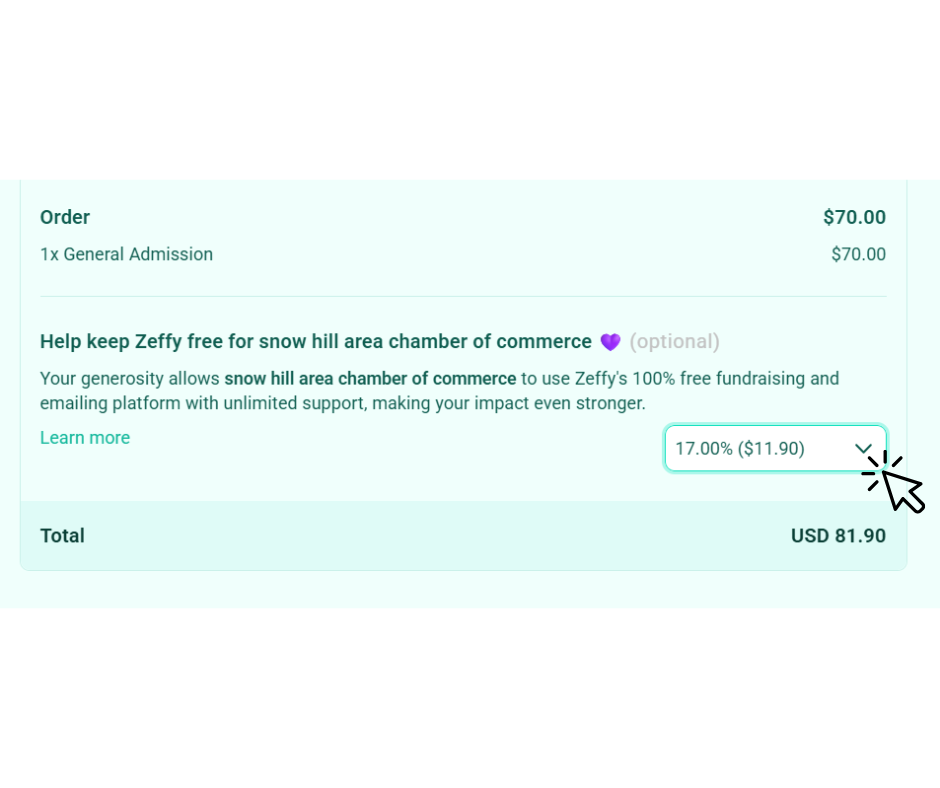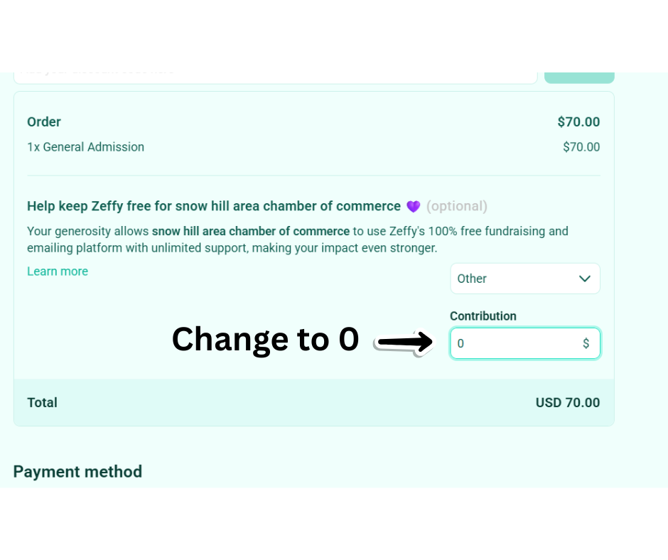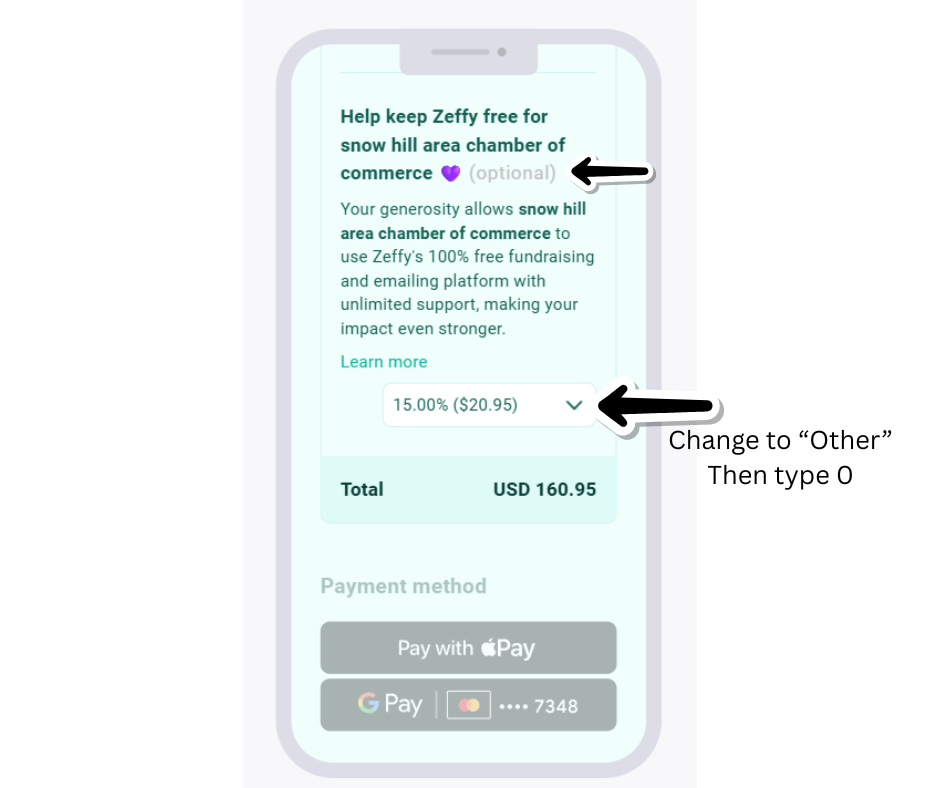 Zeffy defaults this contribution to a 17% fee, however, you can click on the down arrow and change it to “Other”, then type 0 in the box. You won’t be charged any fees on your purchase. Of course, you can always add an additional contribution if you wish, but it is completely optional. 💖
