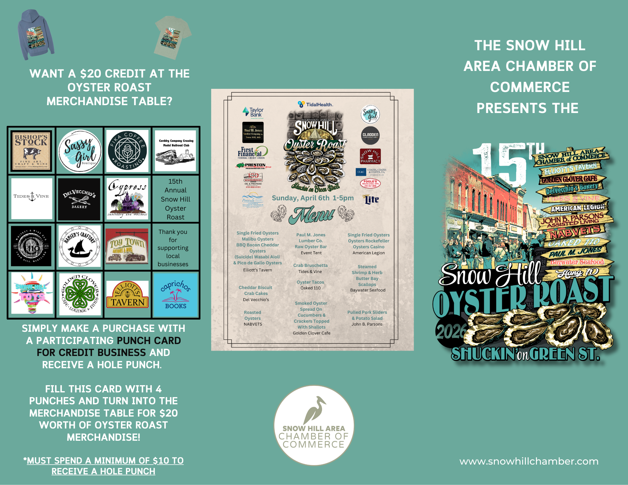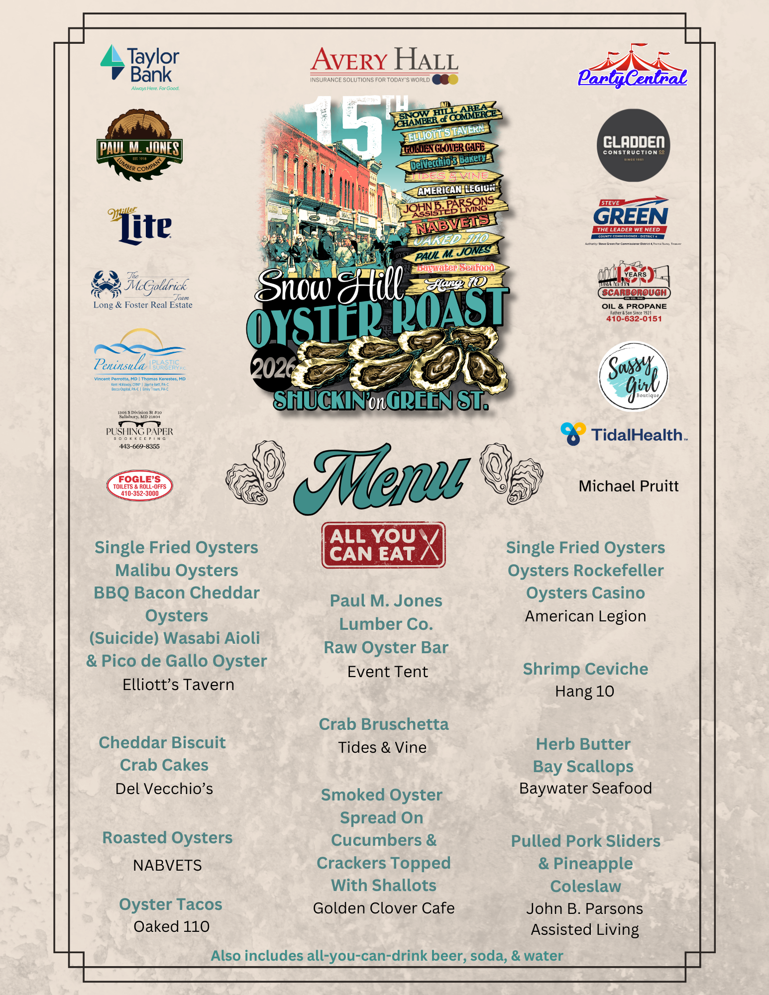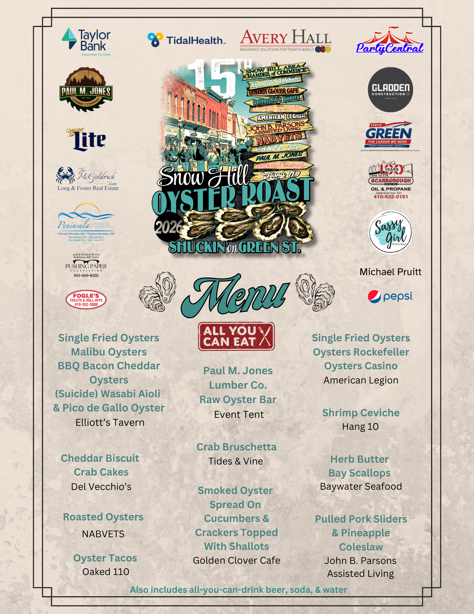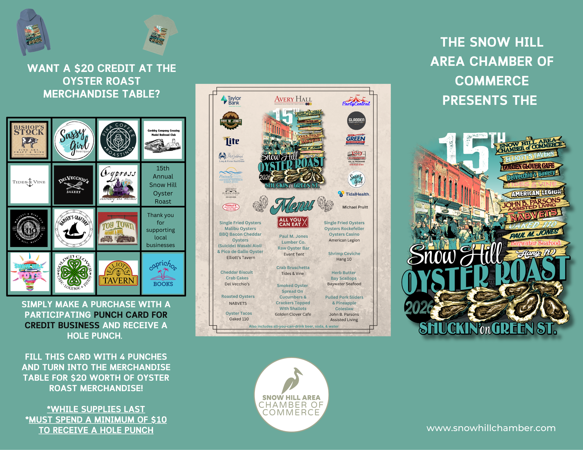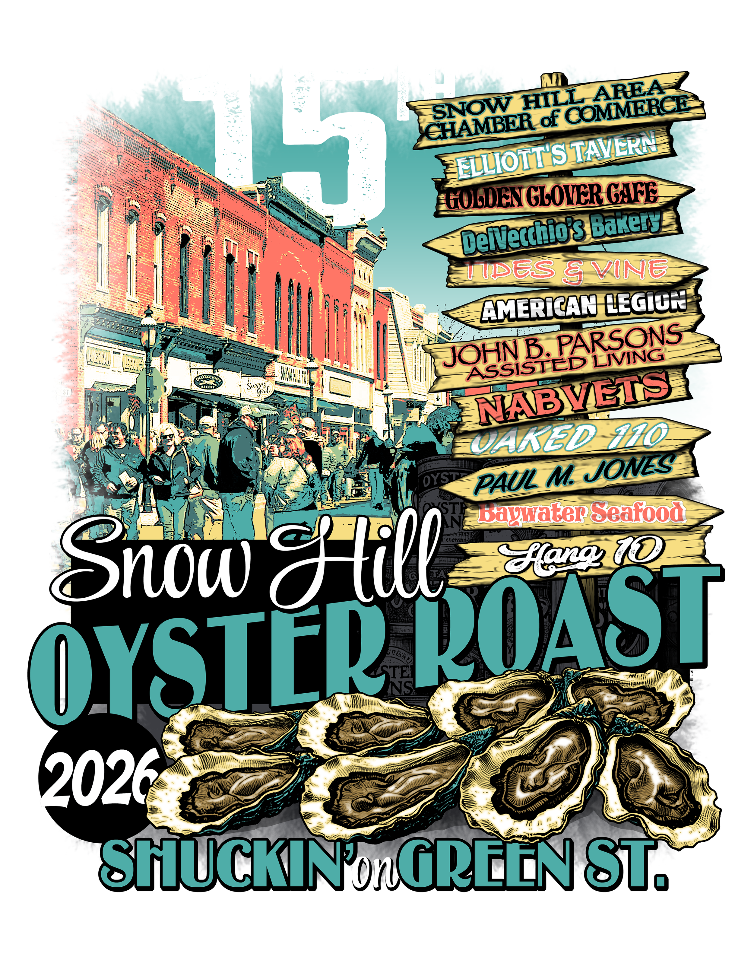 Attention seafood lovers! The 15th Annual Snow Hill Oyster Roast is back and promises to be better than ever. What started 15 years ago has grown into one of Snow Hill’s most beloved traditions, and the Snow Hill Area Chamber of Commerce is excited to invite you to another unforgettable day filled with incredible food, refreshing drinks, music, and fun.